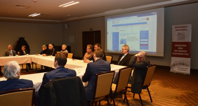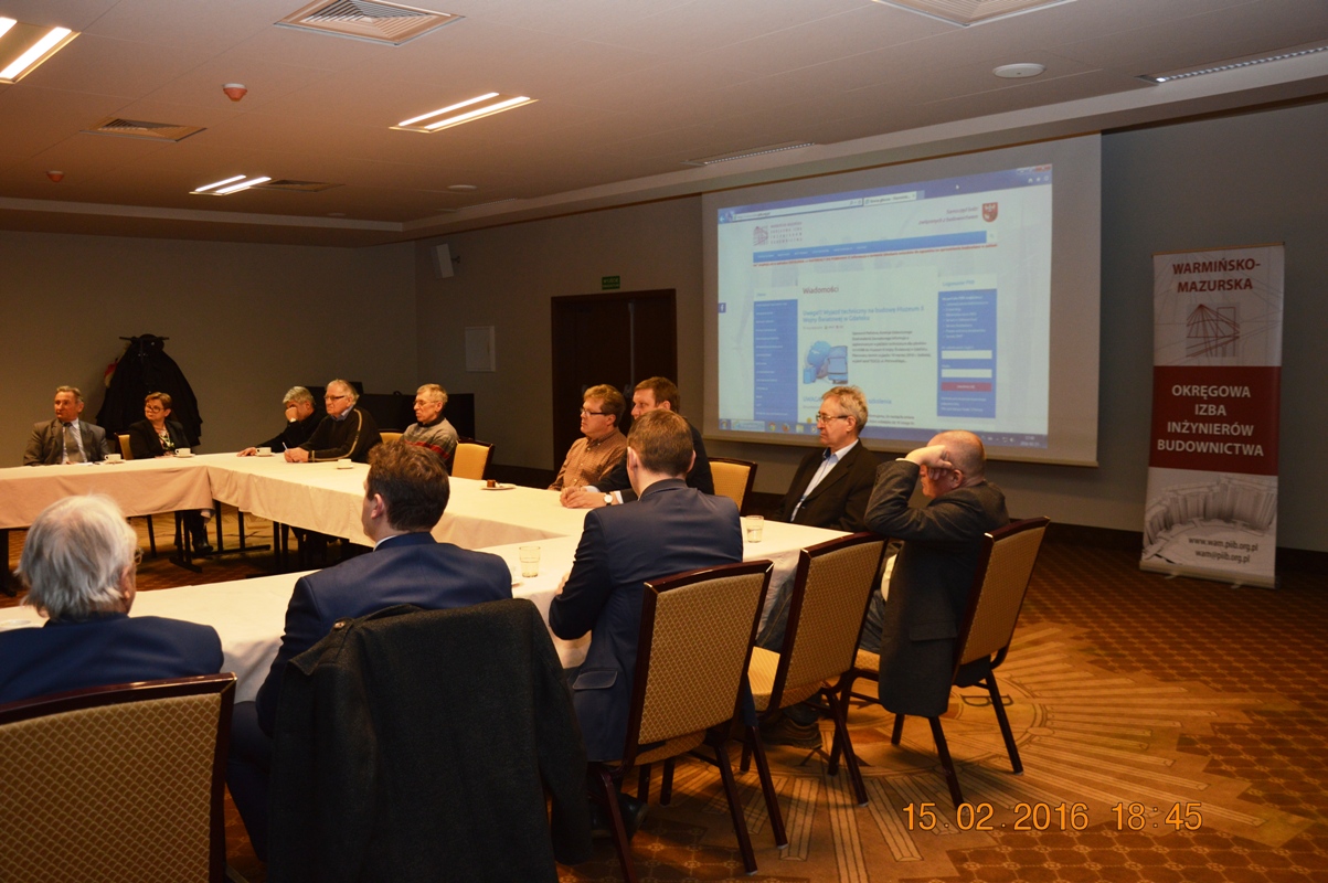 Dnia 15 lutego 2016 r., o godzinie 16.30 odbyło się spotkanie członków W-MOIIB z przedstawicielami komórek lokalnej administracji samorządowej i organów architektoniczno-budowlanych, obejmujących powiat i miasto Lidzbark Warmiński. Celem spotkania było pozyskanie informacji od lokalnych środowisk, członków W-MOIIB w zakresie ich funkcjonowania w obszarach działań ustawowych. Na spotkaniu oprócz 25 członków W-MOIIB byli również obecni: Burmistrz Miasta Lidzbark Warmiński Pan Jacek Wiśniowski, Starosta Lidzbarski Jan Harhaj, Wójt Gminy Kiwity Wiesław Tkaczuk oraz Powiatowy Inspektor Nadzoru Budowlanego Pani Julitta Kowalska. W trakcie spotkania przeprowadzone zostało krótkie seminarium nt. „Nowelizacja ustawy Prawo Budowlane” przez Pana Andrzeja Stasiorowskiego.
