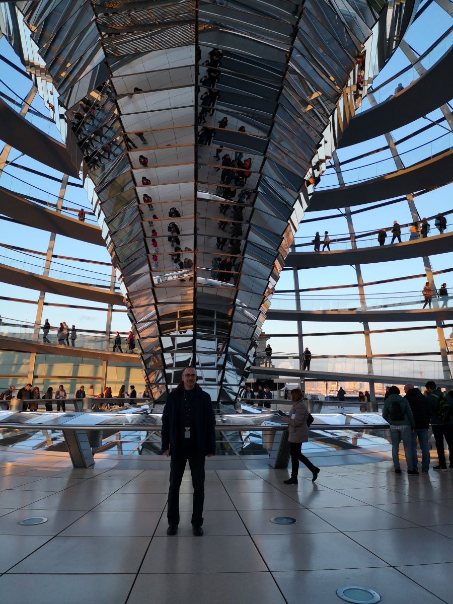 Oryginalna kopuła spłonęła w czasie pożaru w 1933 roku, kiedy Hitler przejął władzę w Niemczech. Nowa 23-metrowa kopuła jest całkowicie współczesna i wykonana jest ze szkła oraz stali. Na szczycie kopuły Reichstagu znajduje się punkt widokowy, do którego prowadzą spiralne rampy o długości 230 metrów i stałym kącie nachylenia 8 stopni. Obiegają one lustrzaną odwróconą iglicę, która kieruje światło słoneczne do położonej poniżej sali plenarnej. Po zwiedzeniu Reichstagu część osób udała się na nocny spacer do miejsca noclegu ok. 1,5 km. Droga wiodła wzdłuż rzeki Szkaprawy poprzez główny dworzec Berlina, który jest drugim co do wielkości dworcem w Europie.