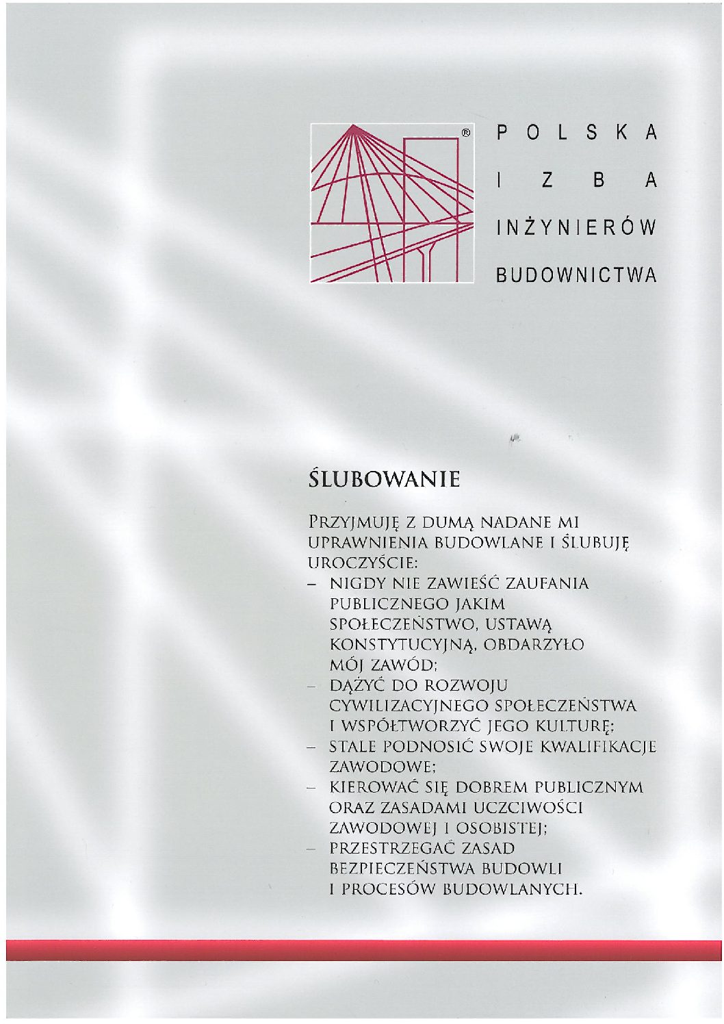 Uchwałą Rady PIIB Nr 18/R/08 z dnia 5 listopada 2008 r. ustanowiono rotę ślubowania, którą składają inżynierowie otrzymujący uprawnienia budowlane.Do przyjęcia ślubowania upoważnieni są, działający łącznie, Przewodniczący Rady i Przewodniczący Okręgowej Komisji Kwalifikacyjnej. Tekst ślubowania odczytała Karolina Moskal. 12 osób zostało nagrodzonych pamiątkowymi dyplomami i „izbowymi” upominkami za osiągnięcie bardzo wysokich wyników na egzaminie.