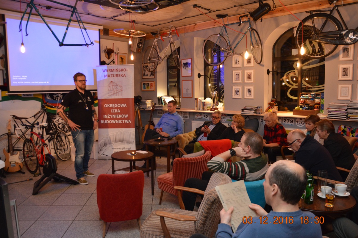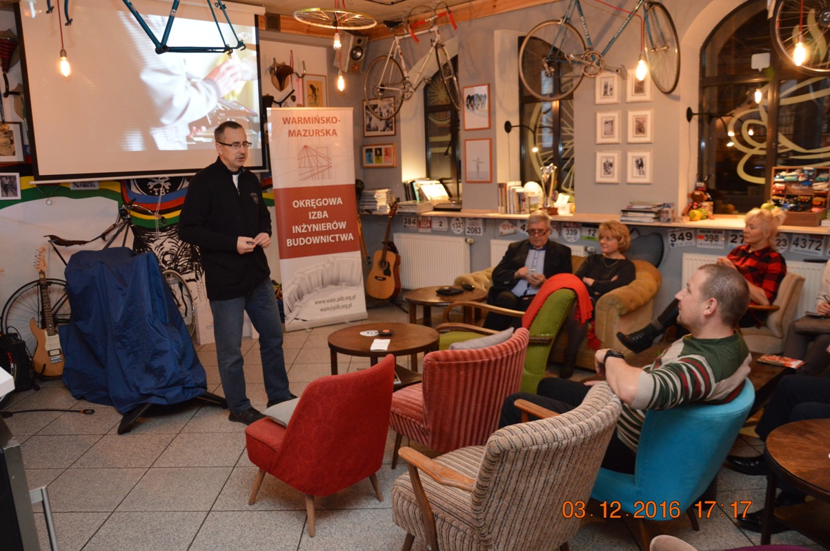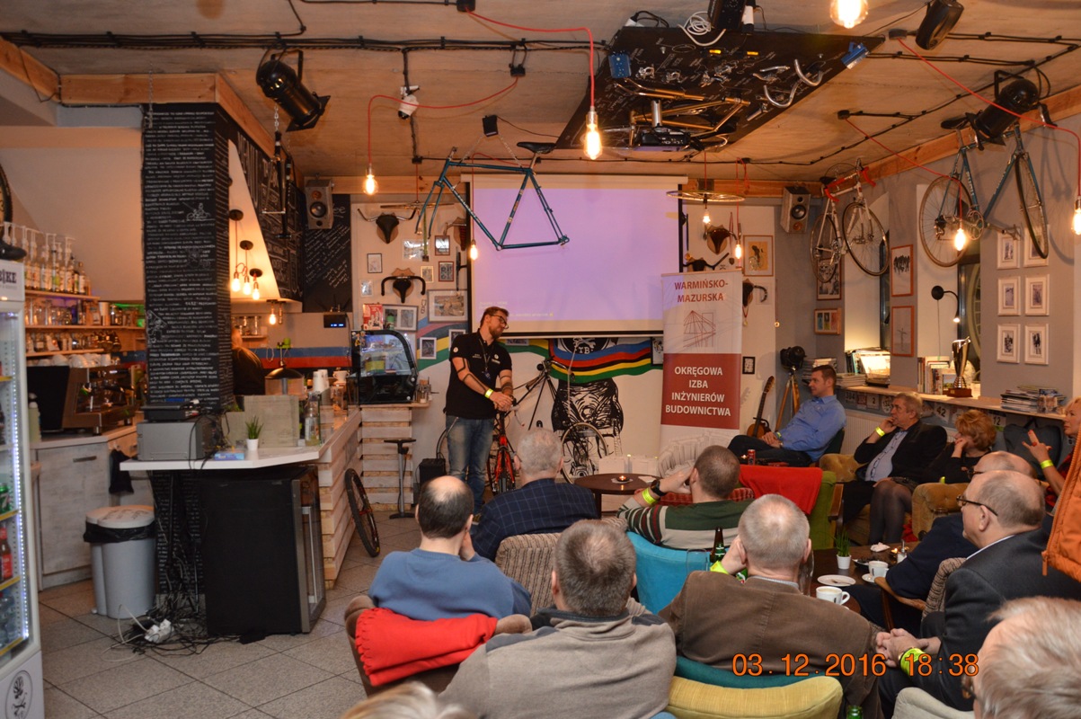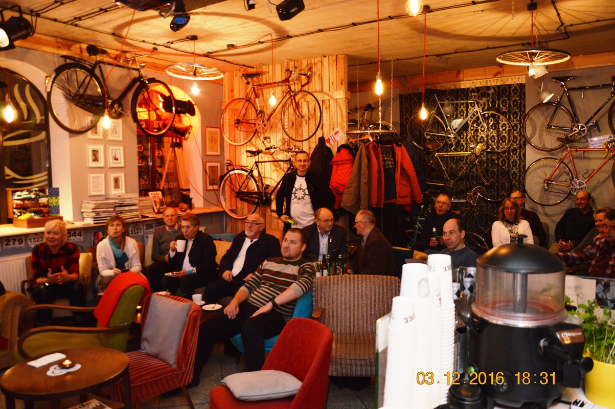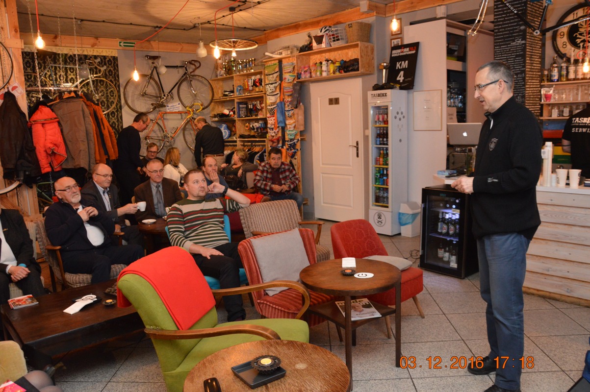 Spotkanie odbyło się w kawiarni TasBike Coffee. Na wstępie po przywitaniu uczestników Kol. Dariusz Stecki Członek Komisji ds. spotkań integracyjnych W-MOIIB a także Prezes Klubu Turystyki Rowerowej "4R" PTTK i jednocześnie wielki pasjonat i propagator turystyki rowerowej i organizator rajdów rowerowych przedstawił propozycję 2 imprez rowerowych na rok 2017 w tym: - 29 kwietnia – 3 maja 2017 (sb.-śr.) Puszcza Białowieska i Białoruś (5 dni)(prezentacja foto) - 27-28 maja 2017 (sb.-nd.) III Rajd Rowerowy Szlakami Warmii i Mazur - Lidzbark Welski (2 dni) pod egidą Kol. Jana Kościńskiego.Po przedstawieniu powyższych propozycji w podsumowaniu roku Kol. Grzegorz Karpa omówił podczas prezentacji zdjęć spotkania integracyjne które odbyły się w roku 2016 w tym :