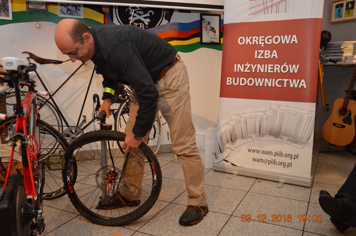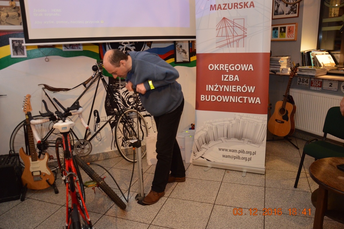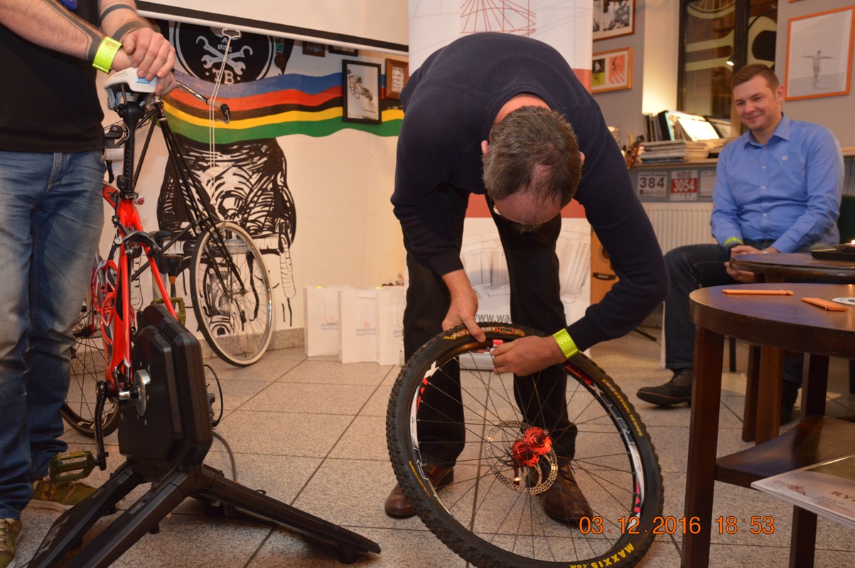 (Zdjęcia i relacje ze spotkań są na bieżąco edytowane na stronie internetowej W-MOIIB) Podczas spotkania nie zabrakło konkursów za udział w których zwycięzcom wręczane były karnety na przeglądy serwisowe rowerów oraz prezenty w formie bidonów na napoje.Odbyły się 3 konkurencje:1. Pompowanie dętki w ciemno. Konkurs polegał na napompowaniu dętki przez zawodnika i oszacowanie przez niego na wyczucie ilości atmosfer. Wygrała osoba, która była najbliżej prawdy.2. Wymiana dętki na czas.3. Przejechanie w określonym czasie najdłuższej trasy na trenażerze rowerowym z podłączeniem do rzutnika multimedialnego z wizualizacją dowolnej trasy.