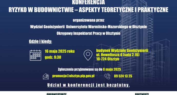 zapraszamy do udziału w Konferencji „Ryzyko w budownictwie – aspekty teoretyczne i praktyczne”, organizowanej przed Wydział Geoinżynierii UW-M oraz Okręgowego Inspektora Pracy w Olsztynie, której jesteśmy Partnerem.