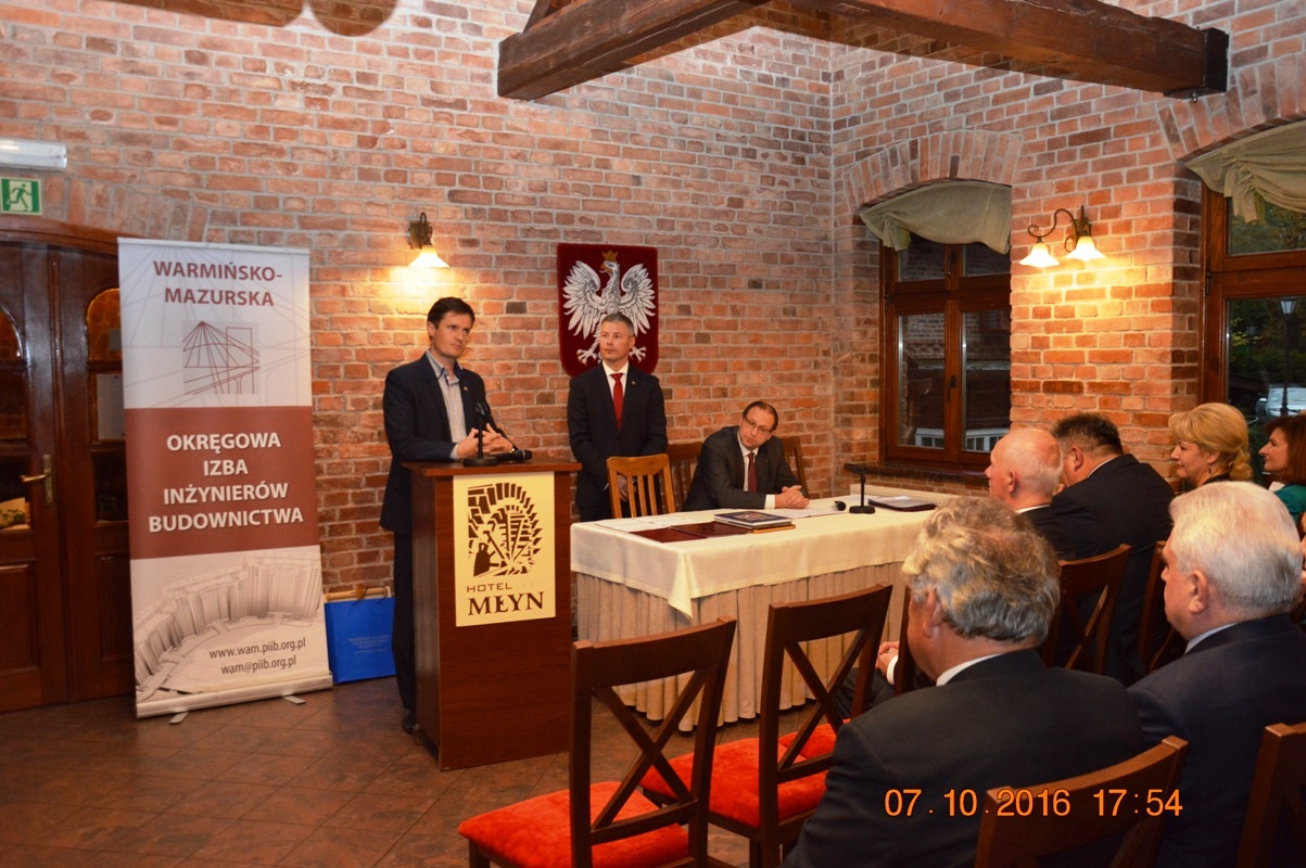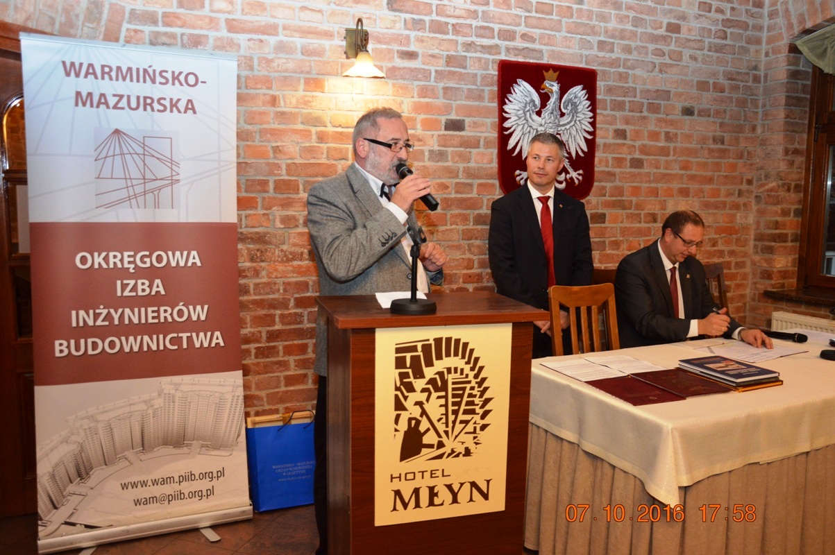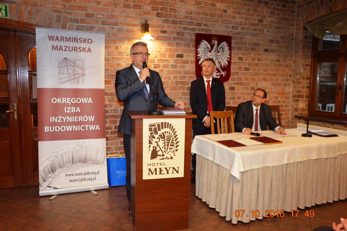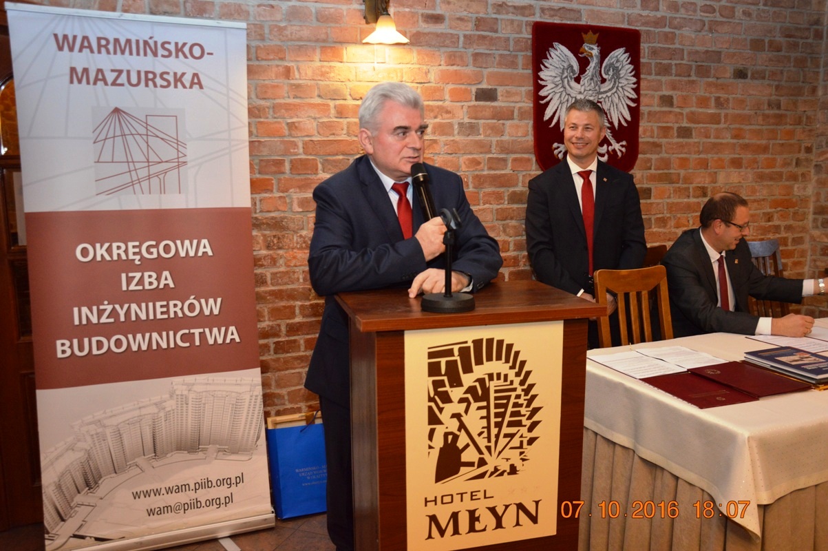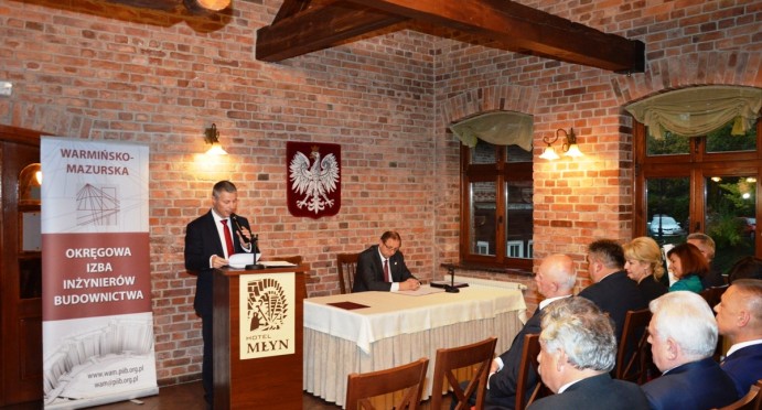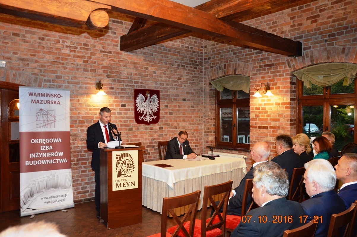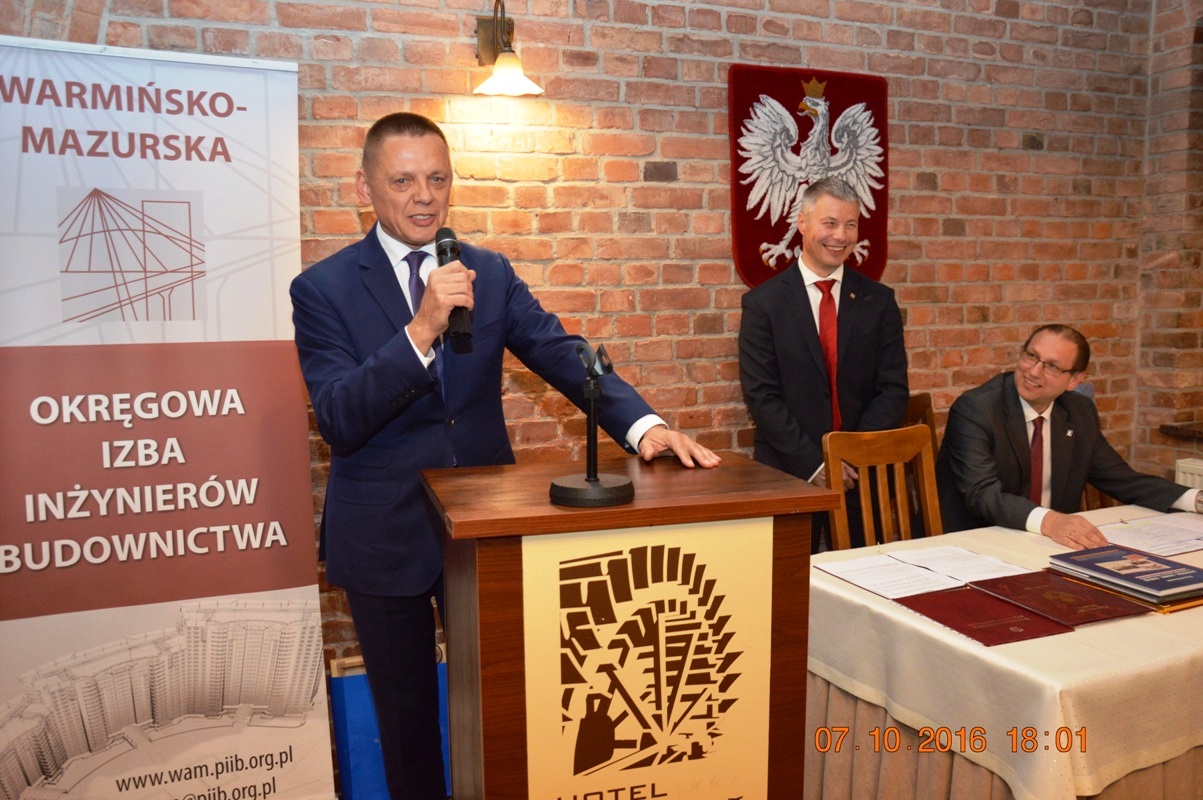 Na początku uroczystości Mariusz Dobrzeniecki Przewodniczący Warmińsko-Mazurskiej Okręgowej Izby Inżynierów Budownictwa wygłosił refleksyjne expose, w którym odniósł się m.in. do nowo tworzonego kodeksu urbanistyczno-budowlanego. Później przyszedł czas na wystąpienia i gratulacje szanownych gości.