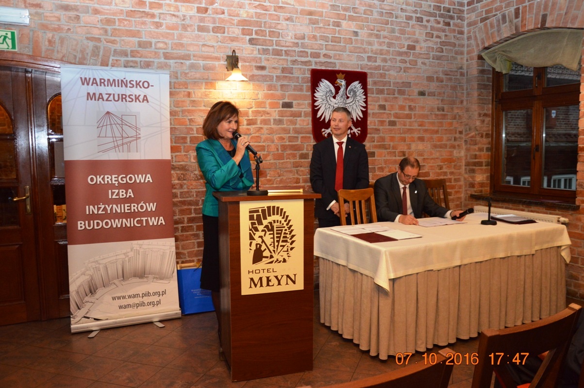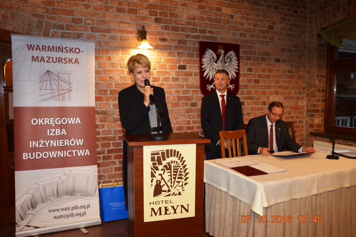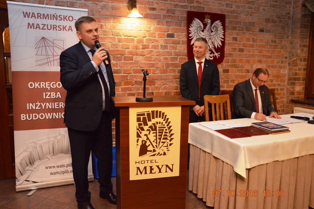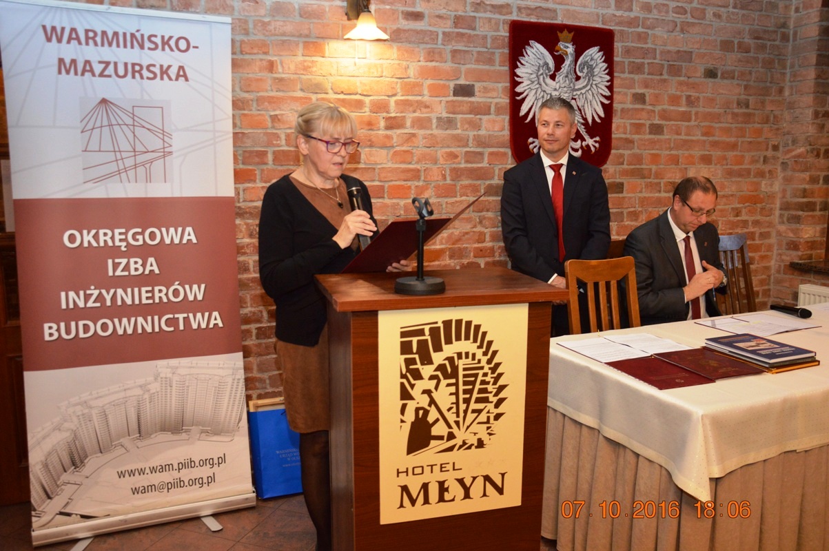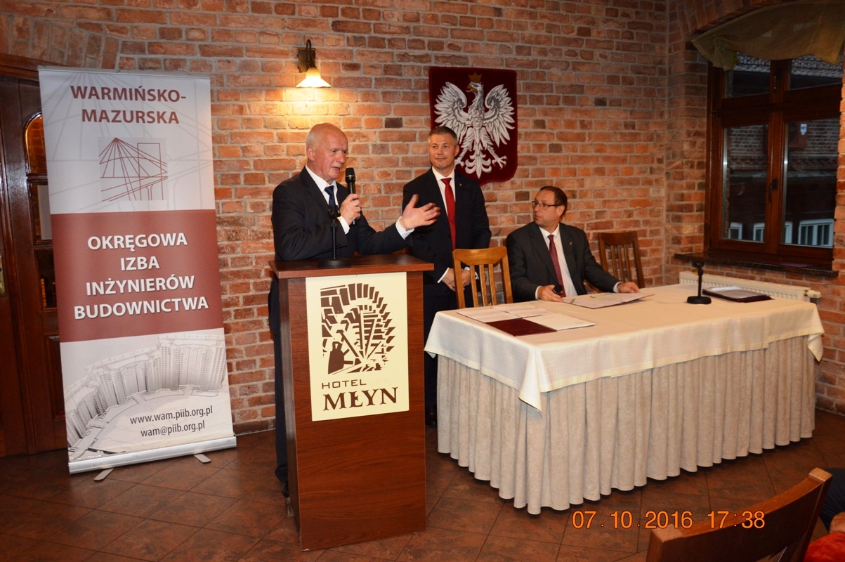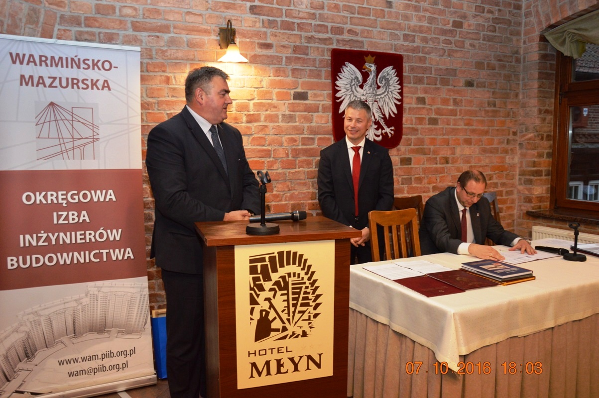 Na początku uroczystości Mariusz Dobrzeniecki Przewodniczący Warmińsko-Mazurskiej Okręgowej Izby Inżynierów Budownictwa wygłosił refleksyjne expose, w którym odniósł się m.in. do nowo tworzonego kodeksu urbanistyczno-budowlanego. Później przyszedł czas na wystąpienia i gratulacje szanownych gości.