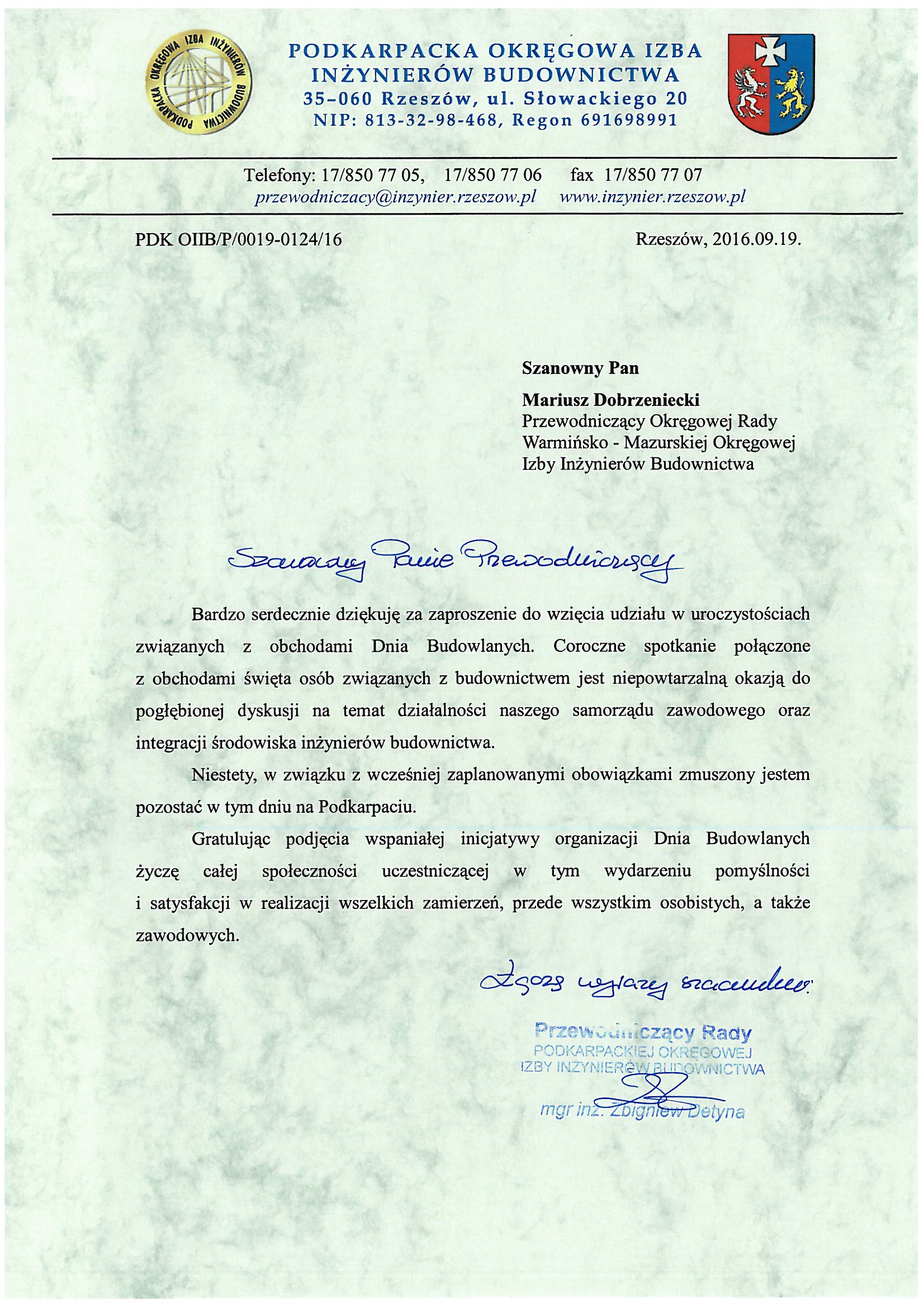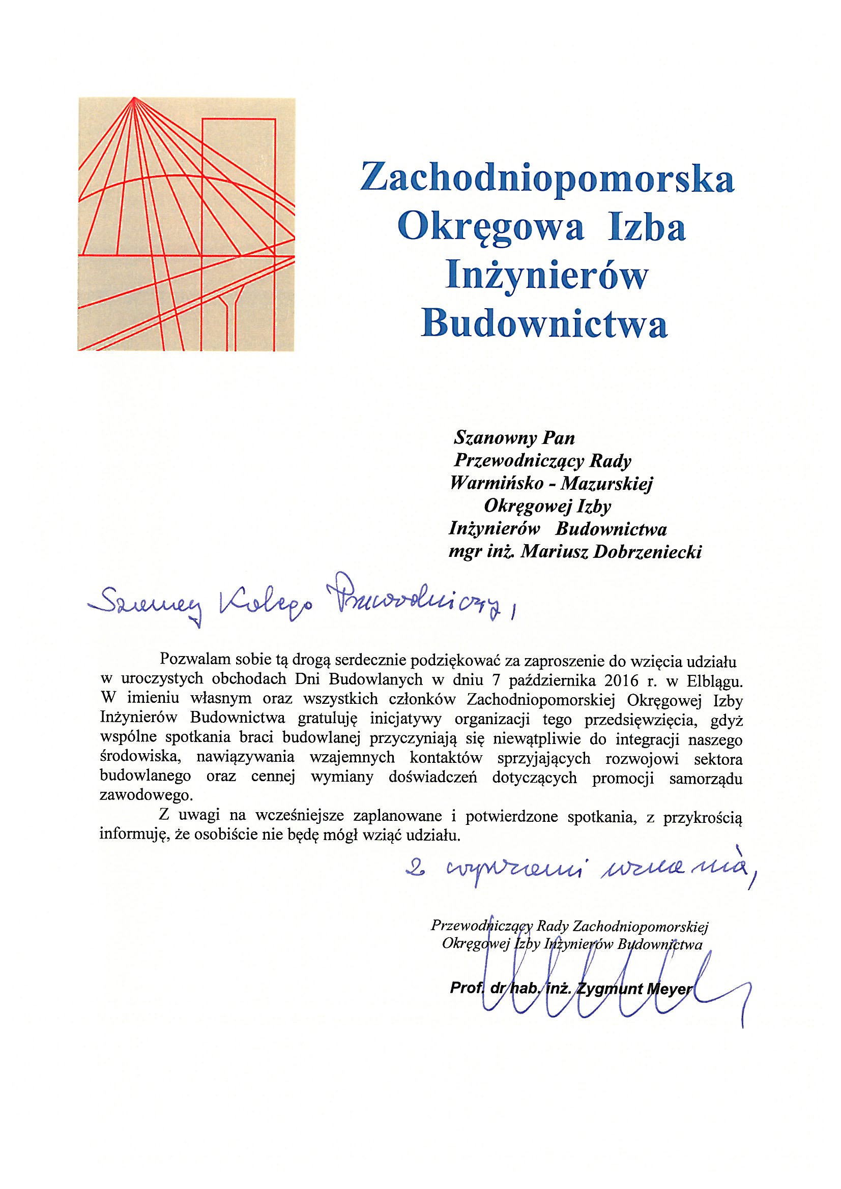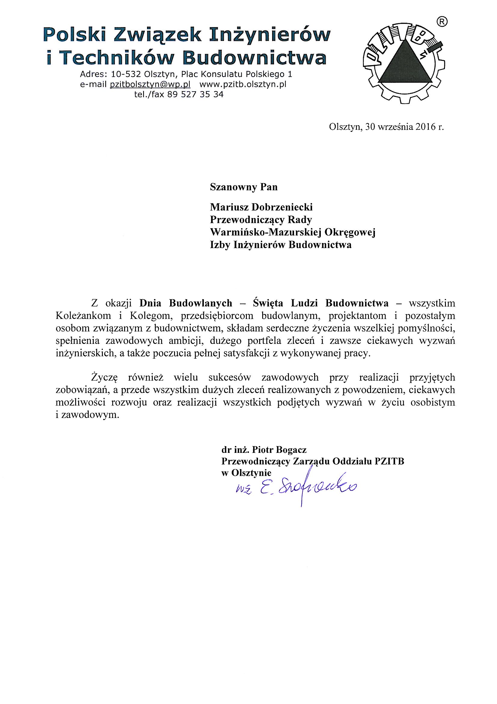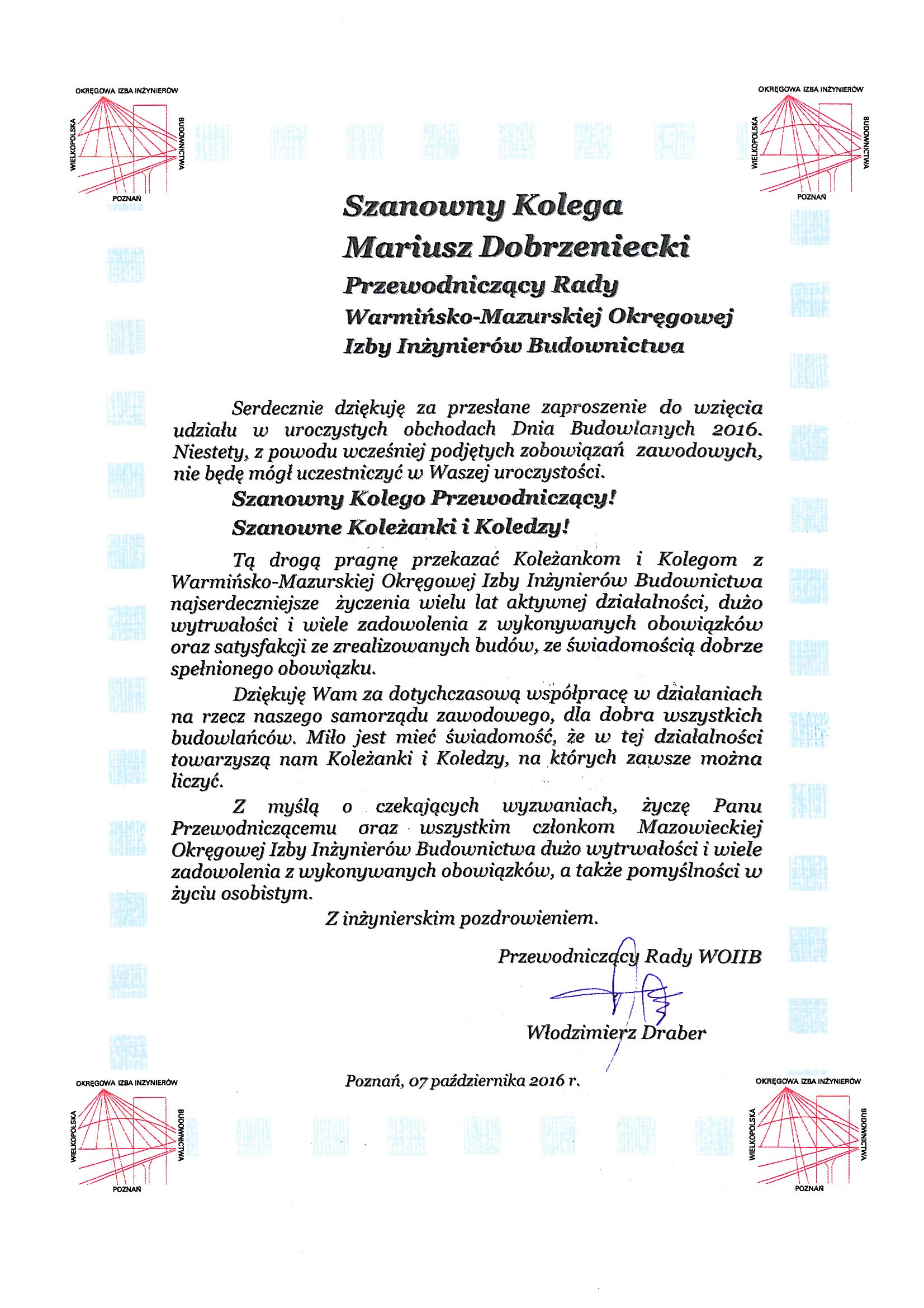 - Mieczysław Grodzki – Przewodniczący Rady Mazowieckiej Okręgowej Izby Inżynierów Budownictwa