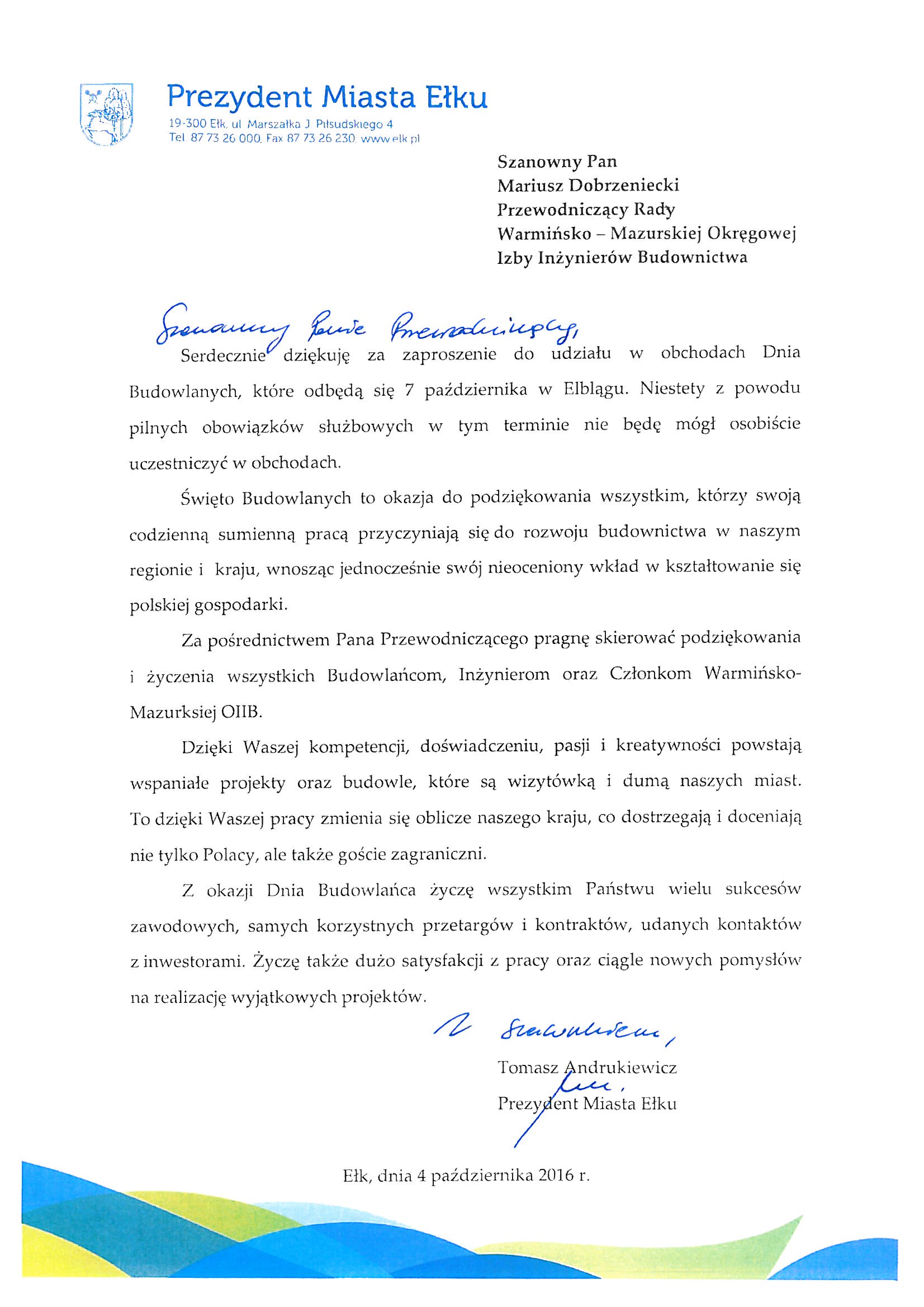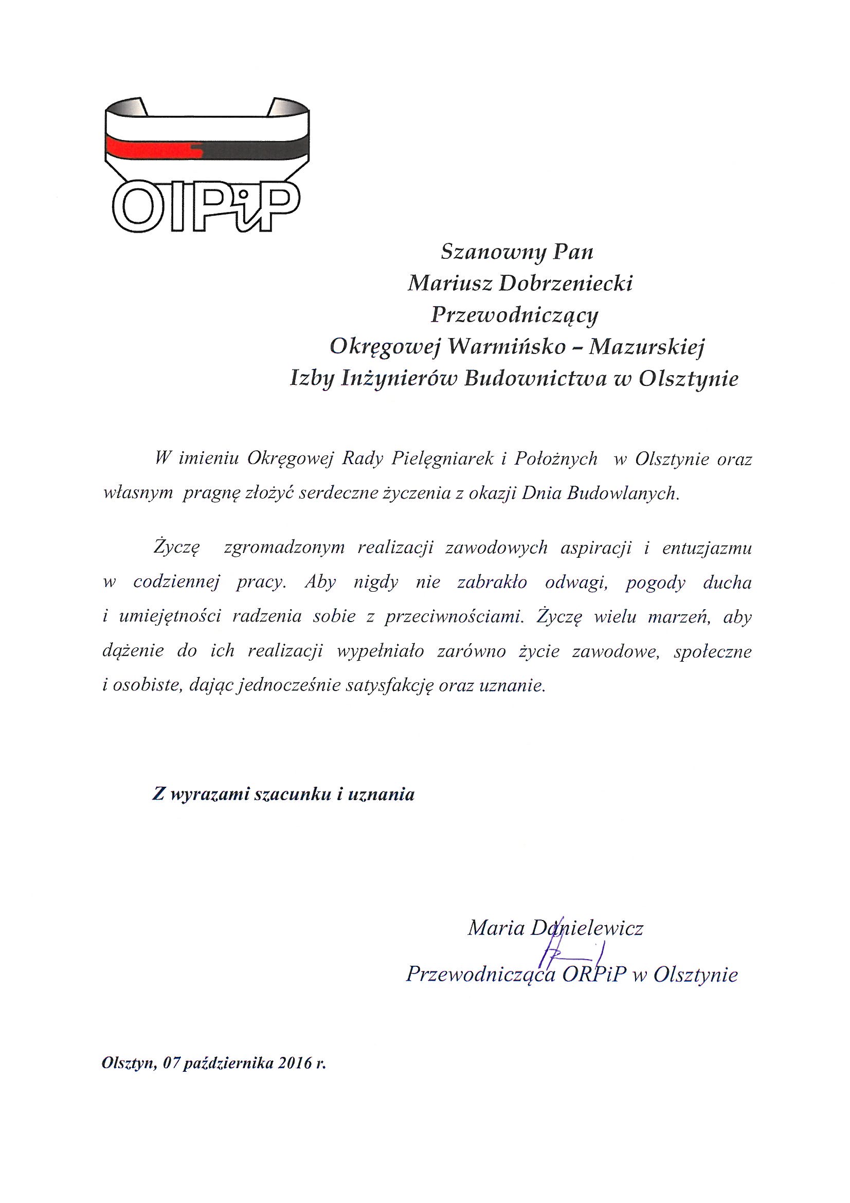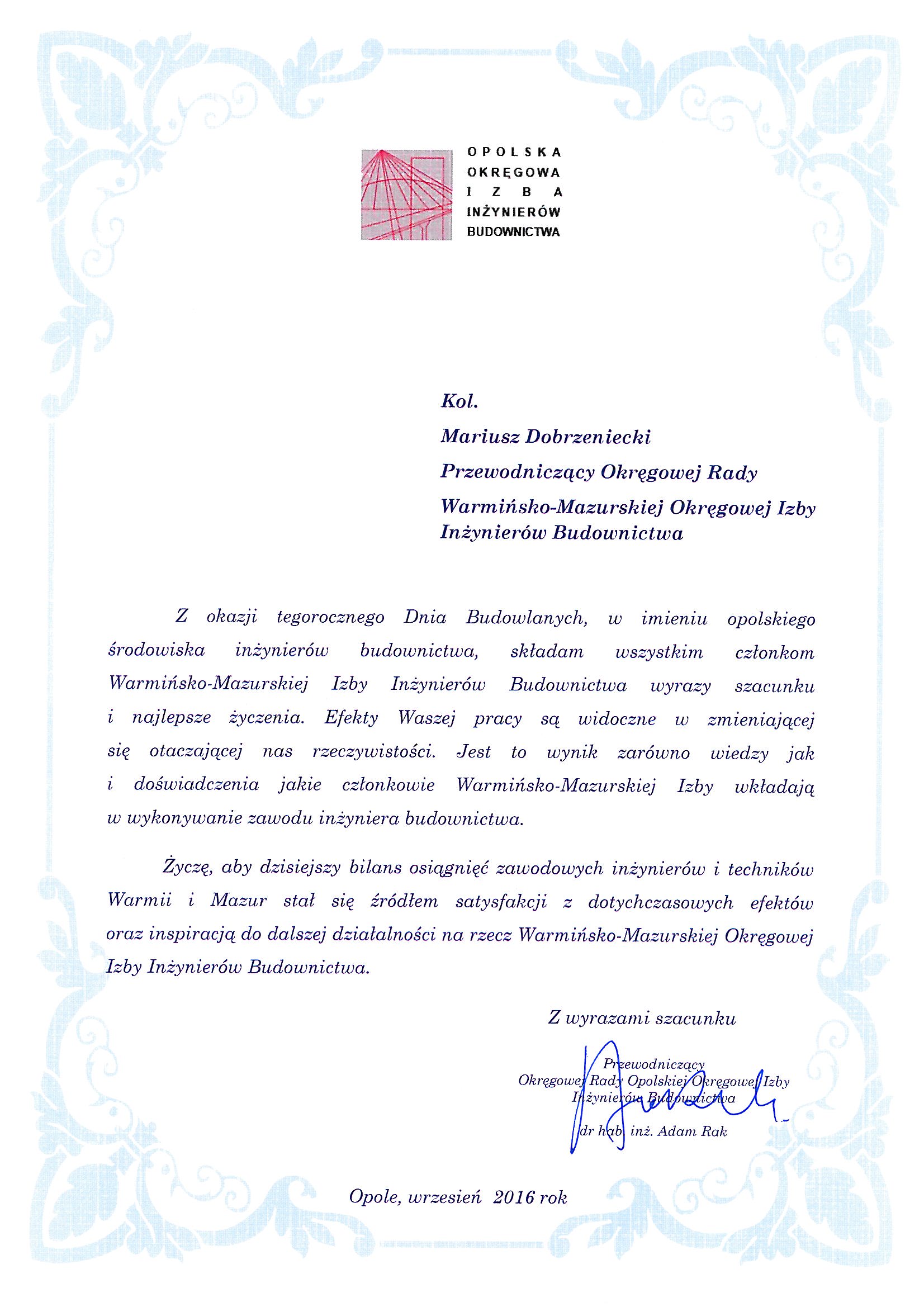 - mgr inż. arch. Mariusz Szafarzyński – Przewodniczący Warmińsko – Mazurskiej Okręgowej Izby Architektów RP