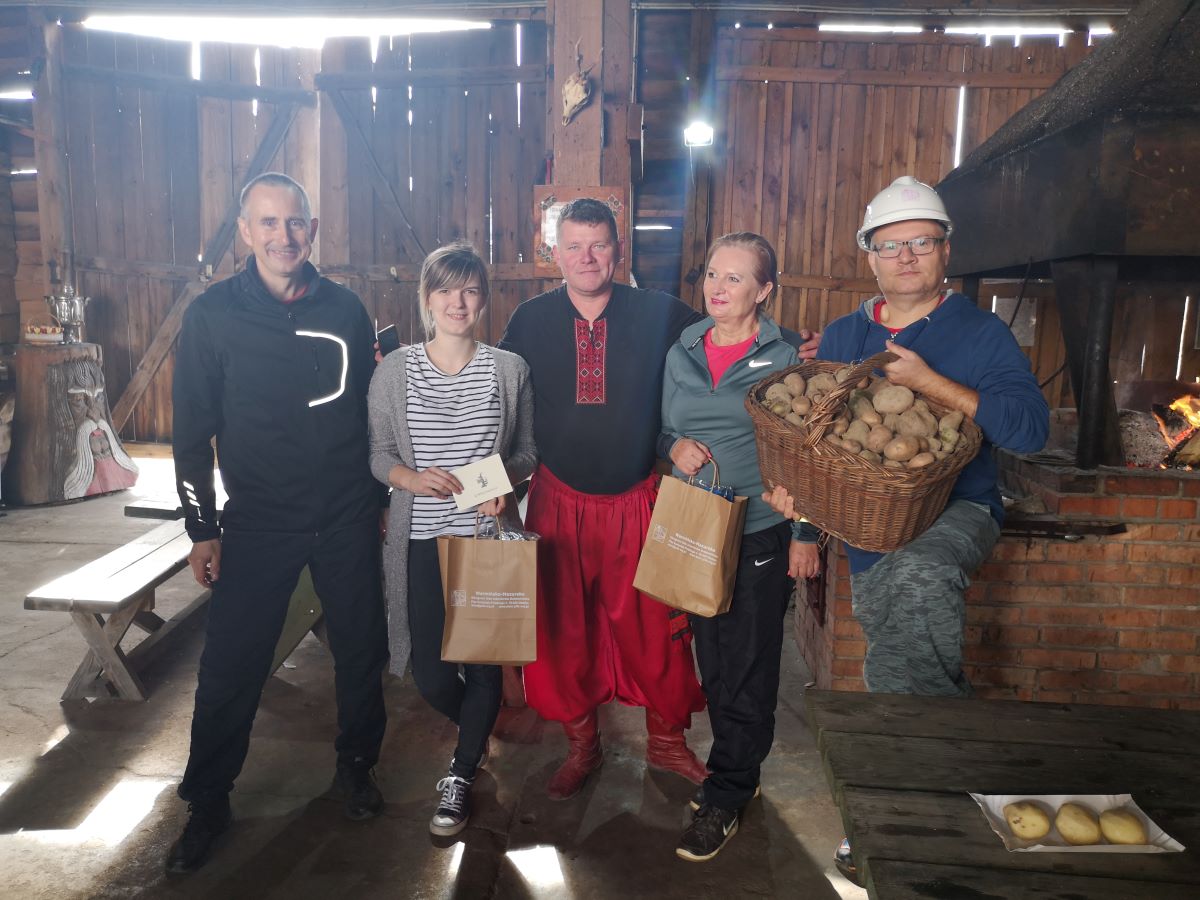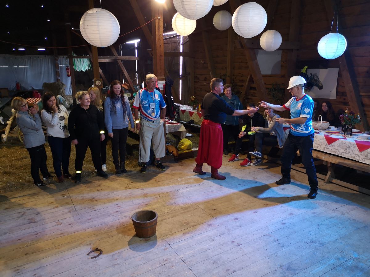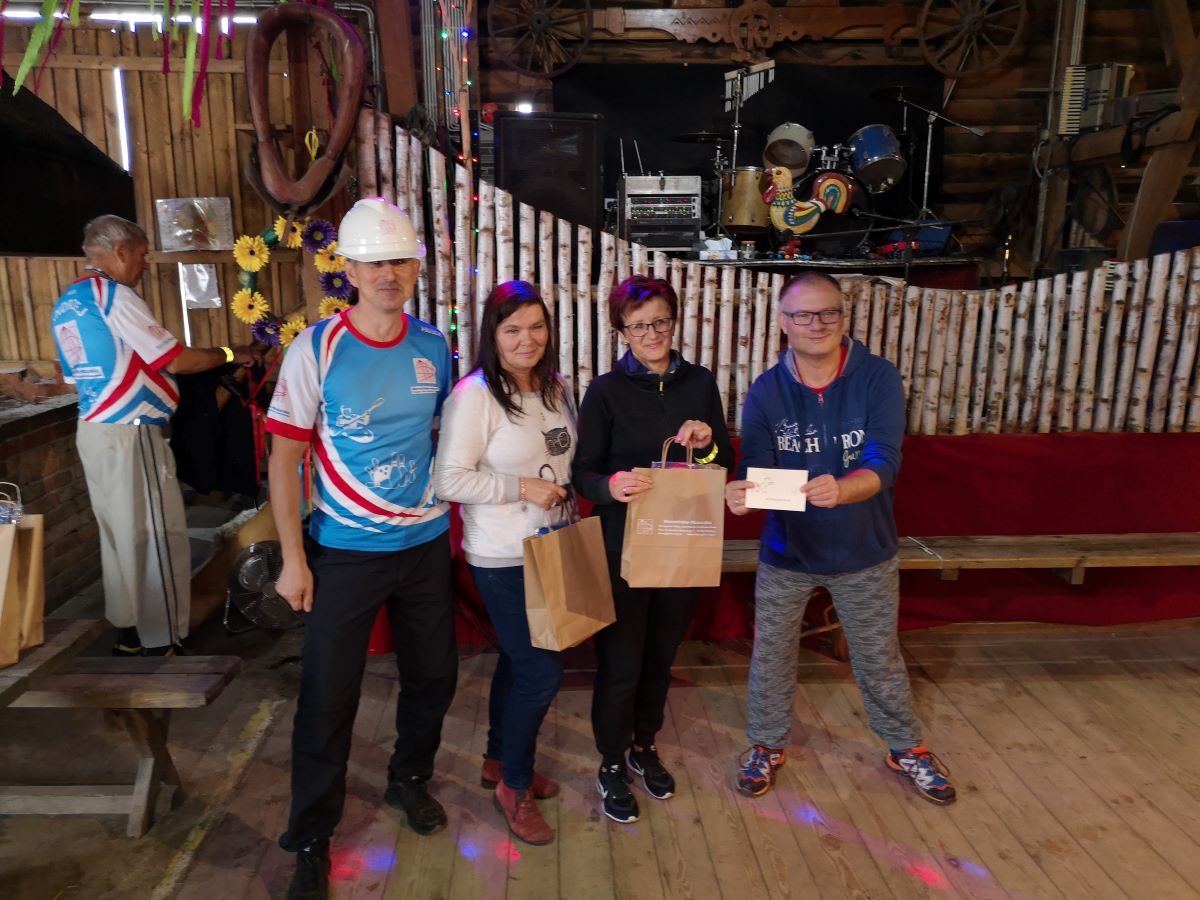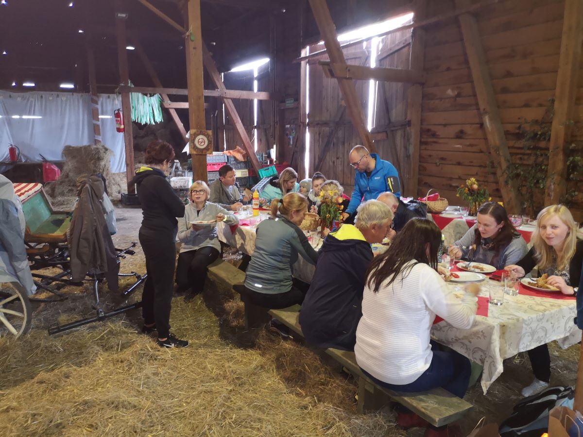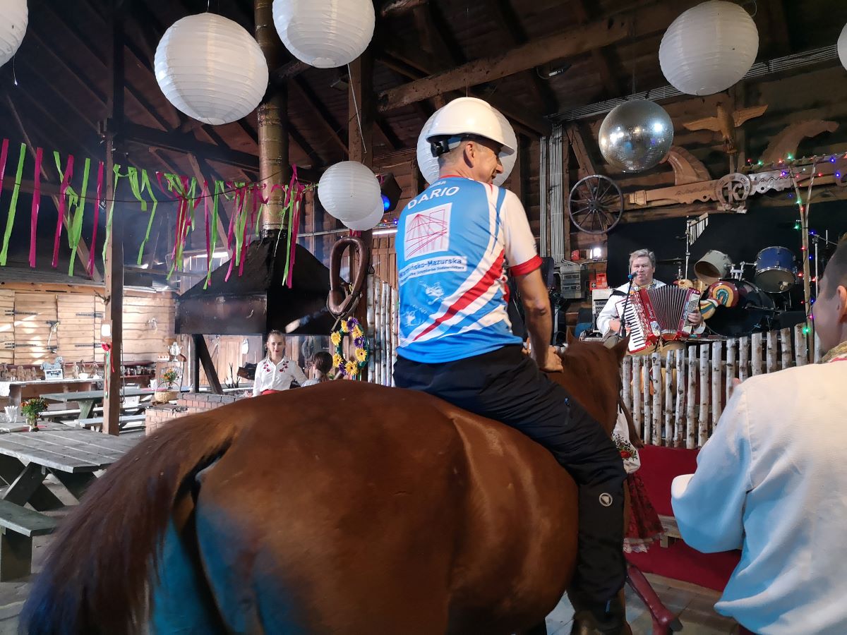 Kolejny rajd rowerowy nie tylko Warmińsko-Mazurskiej Okręgowej Izby Inżynierów Budownictwa, ponieważ mieliśmy zaszczyt zrealizować go wspólnie z przesympatyczną Okręgową Izbą Pielęgniarek i Położnych Regionu Warmii i Mazur z siedzibą w Olsztynie. I właśnie spod siedziby OIPiP rozpoczęliśmy. Otwarcia dokonali Pani Przewodnicząca ORPiP Maria Danielewicz oraz Kol. Sekretarz Rady W-MOIIB Marian Zdunek. Komandor Rowerowy Kol. Dariusz Stecki (Przewodniczący Zespołu ds. organizacji spotkań szkoleniowo-integracyjnych W-MOIIB) i jednocześnie przewodnik wyprawy, poprowadził uczestników szlakiem rowerowym „Łyny”. Po drodze uczestnicy zatrzymywali się przy ciekawych obiektach historycznych, a Kolega Dariusz opowiadał o nich. Nie zabrakło też konkursu na temat wiedzy o naszym mieście, zwycięzców nagrodzono. Po przejechaniu szlaku ok. 12 km spotkanie kontynuowaliśmy w gospodarstwie agroturystycznym Janusza Kojrysa. Nie zabrakło pieczenia kiełbasek i regionalnego jadła. Rozegraliśmy wiele konkursów z nagrodami, w tym rzut podkową czy obieranie ziemniaka, a nagrody te były oryginalne – karnety na naukę jazdy konnej i udział w zabawie „Andrzejkowej” w stodole. W ramach lokalnych atrakcji skorzystaliśmy z przejażdżki wozem oraz z możliwości skoku ułańskiego na konia bez siodła. Dobrą zabawę umilał nam lokalny wodzirej i niewiasty, ubrani w ludowe stroje i wciągający nas w wymyślne tańce, a to wszystko okraszone muzyką płynącą z akordeonu.