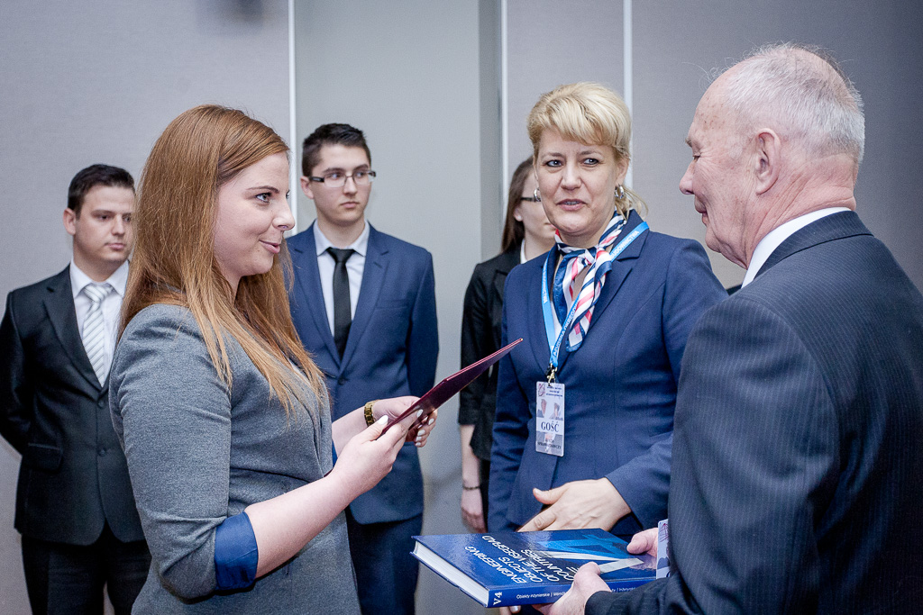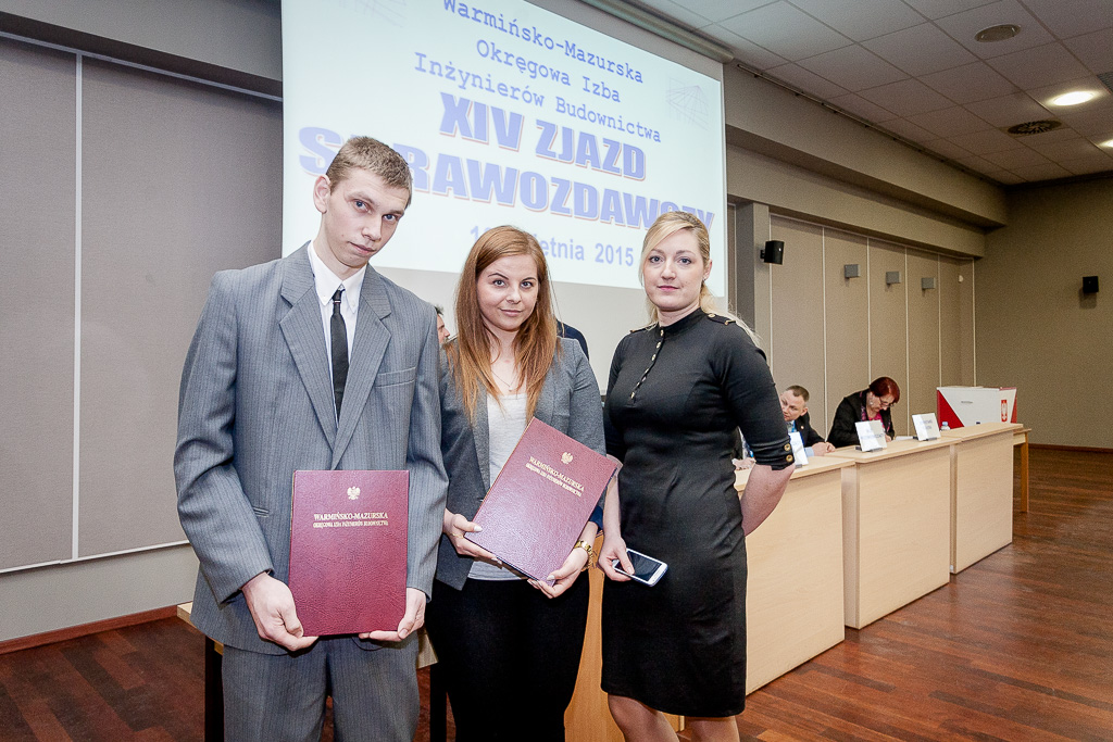 Następnie dokonano ceremonii wręczenia nagród wytypowanym przez dyrekcje szkół najlepszym uczniom kształcącym się na kierunkach technicznych o profilu budowlanym. Wręczenia pamiątkowych dyplomów i nagród książkowych dokonali Prezes Krajowej Rady Polskiej Izby Inżynierów Budownictwa – Pan Andrzej Roch Dobrucki i Zastępca Prezydenta Olsztyna – Pani Halina Zaborowska – Boruch.