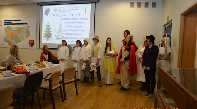 W dniu 3 grudnia 2015 roku w siedzibie Warmińsko-Mazurskiej Izby Inżynierów Budownictwa w Olsztynie odbyło się ostatnie w tym roku spotkanie Rady W-MOIIB. Czas Świąt Bożego Narodzenia jest czasem budzącym ciepłe skojarzenia wielu ludzi, jest czasem szczególnej życzliwości, dobroci dla siebie oraz pamiętania o potrzebujących, którym pomaganie przychodzi na ogół łatwiej niż na co dzień. Tradycyjnie po zebraniu Rady odbyło się Spotkanie Wigilijne, na którym gościliśmy dzieci z Domu Dziecka przy ul. Korczaka 6 w Olsztynie. Podczas spotkania przedstawiono jasełka, śpiewano kolędy oraz wręczono świąteczne upominki przez Mikołaja, w którego rolę wcielił się Przewodniczący Rady W-MOIIB Pan Mariusz Dobrzeniecki.