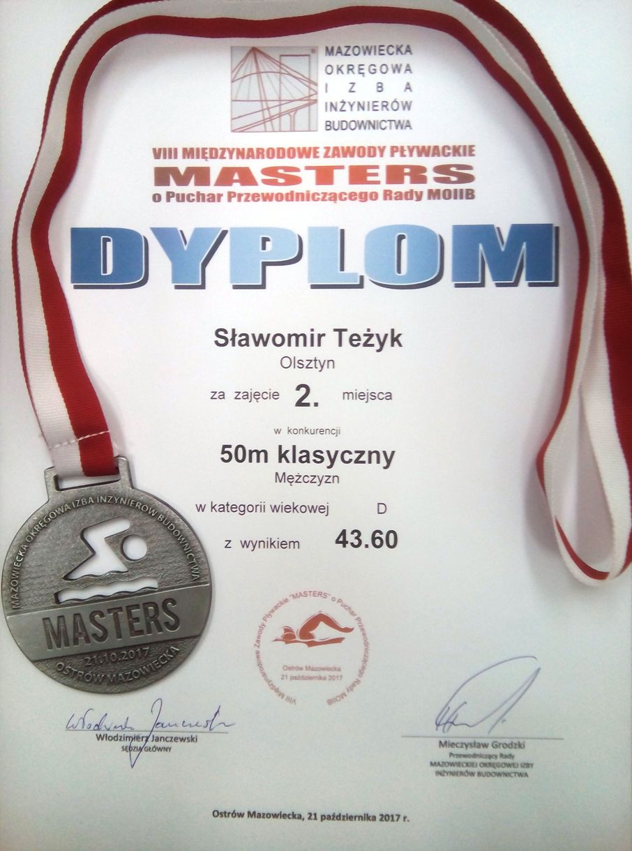 Warmińsko-Mazurską Okręgową Izbę Inżynierów Budownictwa podczas VIII Międzynarodowych Zawodów Pływackich MASTERS o Puchar Przewodniczącego Rady Mazowieckiej Okręgowej Izby Inżynierów Budownictwa reprezentował Kol. Sławomir Teżyk zajmując 2 miejsce w konkurencji 50m klasyczny mężczyzn i zajmując 1 miejsce w konkurencji 25m dowolny mężczyzn.